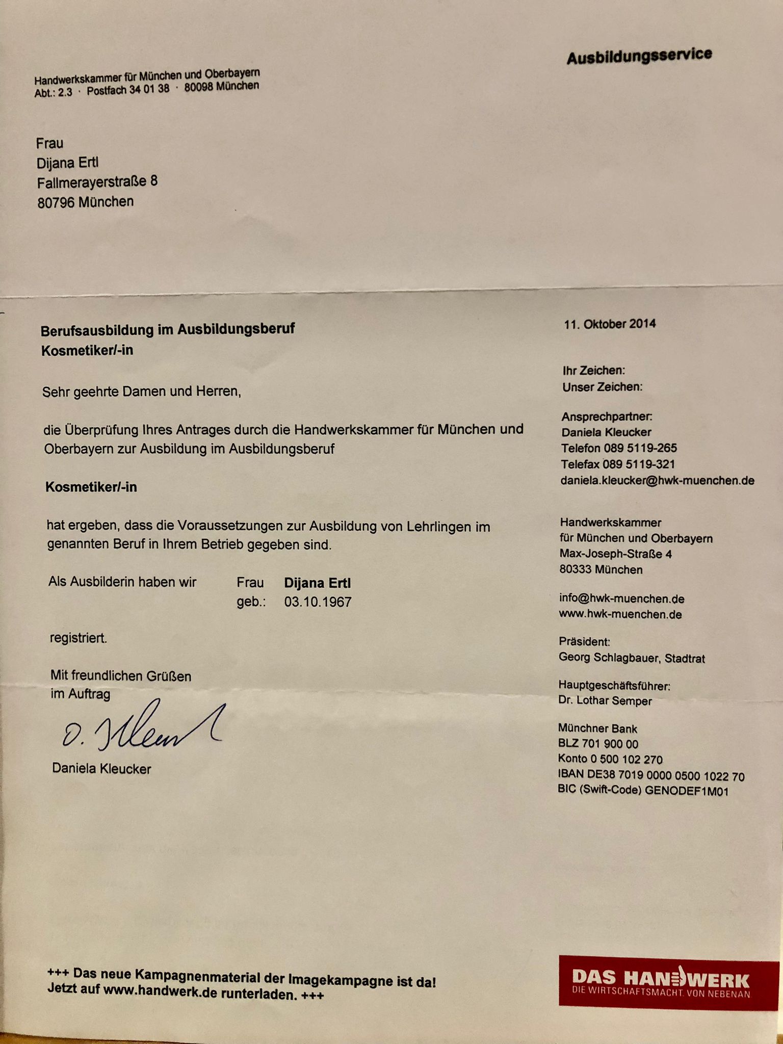 Als Lehrerin und Trainerin für die junge Generation im Kosmetikbereich wurde ich zweimal von der Industrie- und Handwerkskammer München ausgezeichnet. Das erstenmals als beste Ausbilderin für die gesamte Region Oberbayern in Deutschland und das zweiten mal für ganz Deutschland.